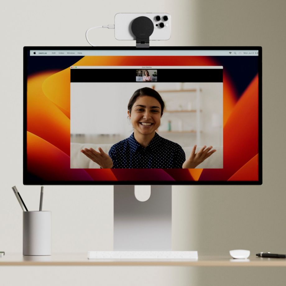 Verbinde dein iPhone mit Hilfe von MagSafe an deinem Mac Desktop oder an deinem Display. Mit Hilfe der neuesten Version von MacOS und iOS kannst du die iPhone Kamera kabellos als Kamera für deinen Mac nutzen.