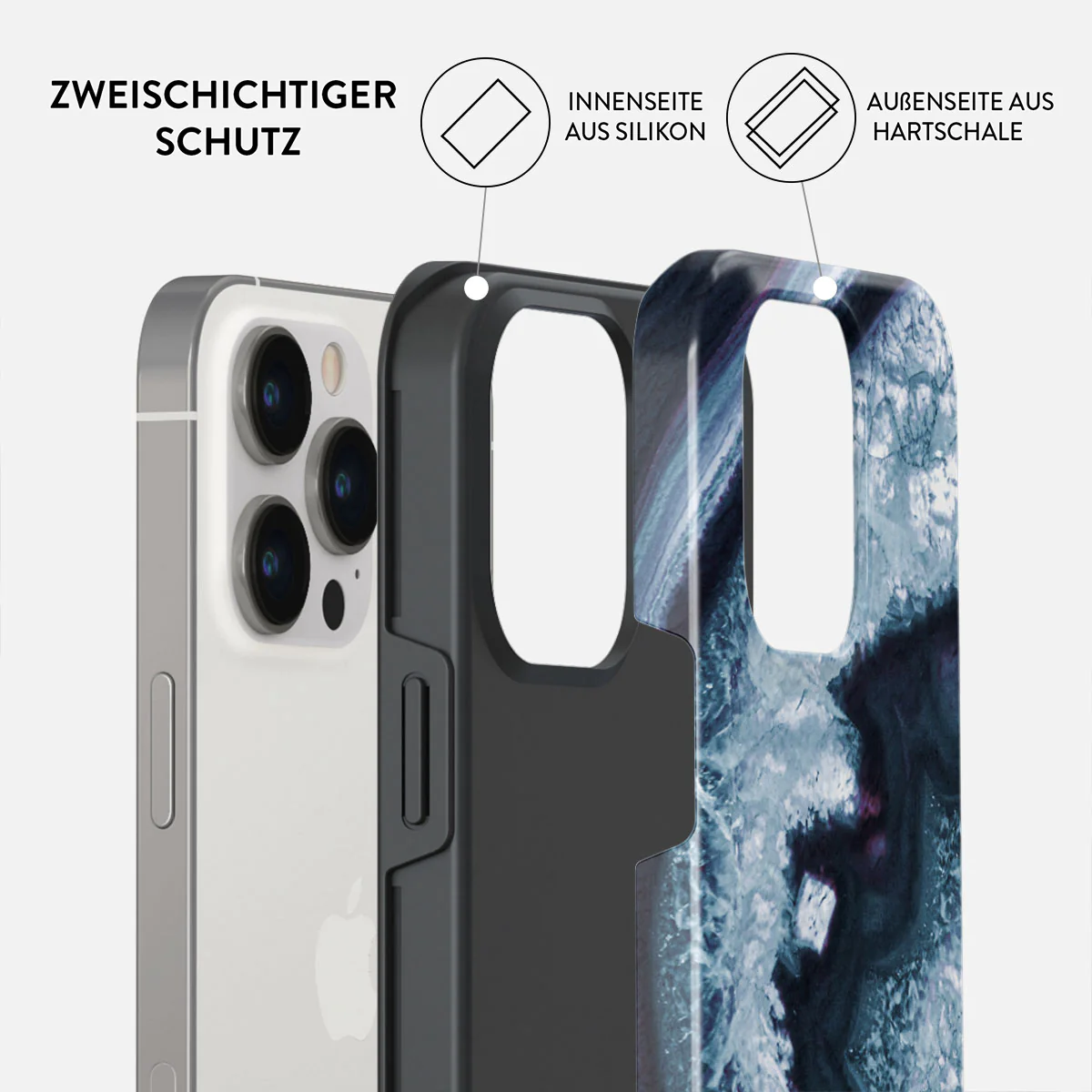 - Zweischichtig: Innenseite Silikon + Außenseite Hartschale