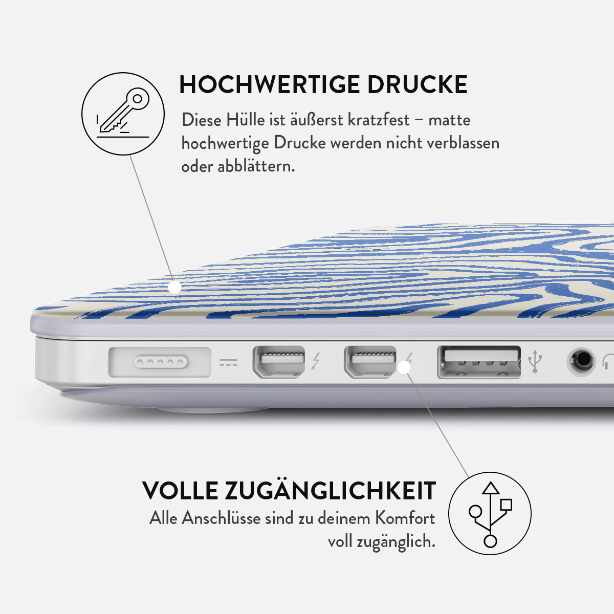 In jedem Fall ist die BURGA MacBook-Hülle ein unverzichtbares Accessoire für dein tägliches mobiles Arbeitstier. Sie wird mit zwei separaten Abdeckungen für die Ober- und Unterseite deines Laptops geliefert und bietet so einen 360°-Schutz. Trotzdem behält sie ihr schlankes Profil bei und lässt dein MacBook nicht klobig wirken. Die untere Abdeckung hat außerdem eine Belüftung, damit dein Laptop nicht überhitzt, wenn du zum Beispiel... nun ja... auf dem Schoß sitzt! Was willst du noch von einer MacBook-Hülle? Richtig - leicht zugängliche Anschlüsse. Auch dafür haben wir gesorgt.
