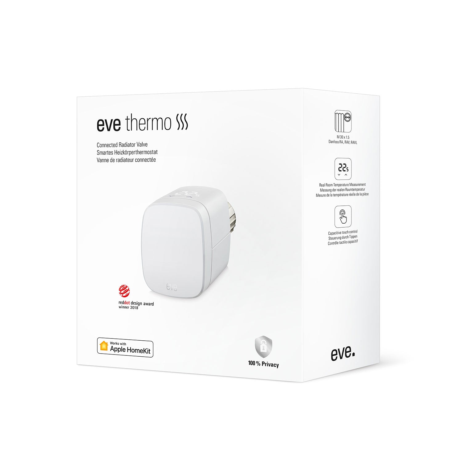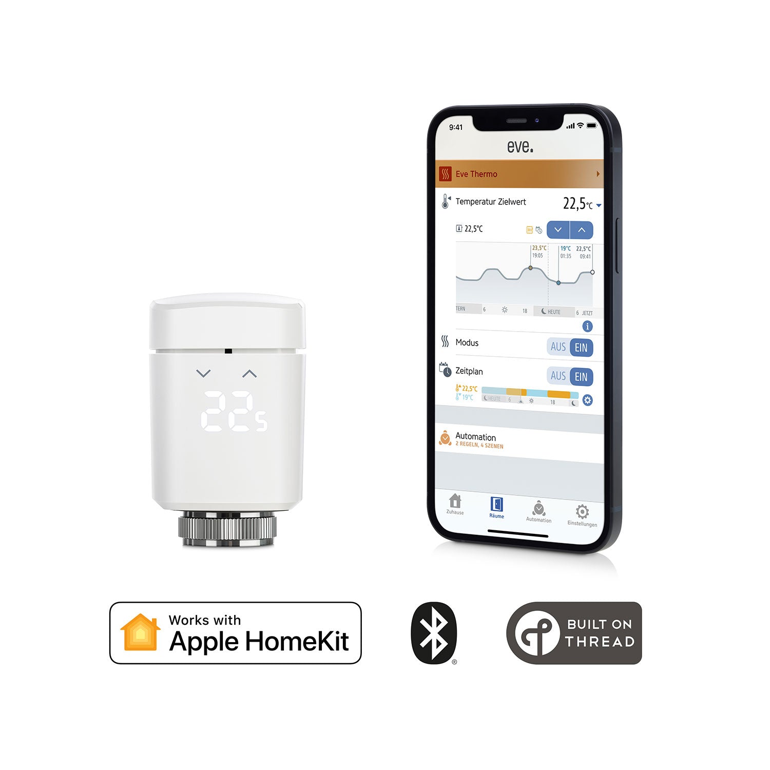 Mit Eve Thermo sorgt deine Heizung automatisch für die perfekte Temperatur, passend zu deinem Tagesablauf. Lege mühelos Zeitpläne an, die einzelne Räume oder das ganze Haus automatisch heizen - unabhängig von iPhone oder Internet. Oder steuere deine Raumtemperatur ganz bequem per App, Siri, das integrierte Touch-Bedienfeld oder anhand deiner Anwesenheit. Wann immer du kommst und gehst, Eve Thermo regelt deine Heizung passend dazu: Energie sparend, wenn du unterwegs bist. Behaglich warm, wenn du es dir zu Hause gemütlich machst. Eve Thermo integriert sich automatisch in ein Thread-Netzwerk und steht dank Apple HomeKit-Technologie für herausragenden Bedienkomfort auf iPhone, iPad und Apple Watch. Eve Thermo lässt sich schnell montieren und einrichten und benötigt keine Bridge. Das höchste Gut aller Eve-Geräte ist der Schutz deiner Privatsphäre: Eve sammelt keine personenbezogenen Daten und verfügt über keine Cloud. Im Lieferumfang: Eve Thermo, 2x AA Batterien, Adapter Set für Österreich (M28 x 1,5), Montagezubehör, Handbuch