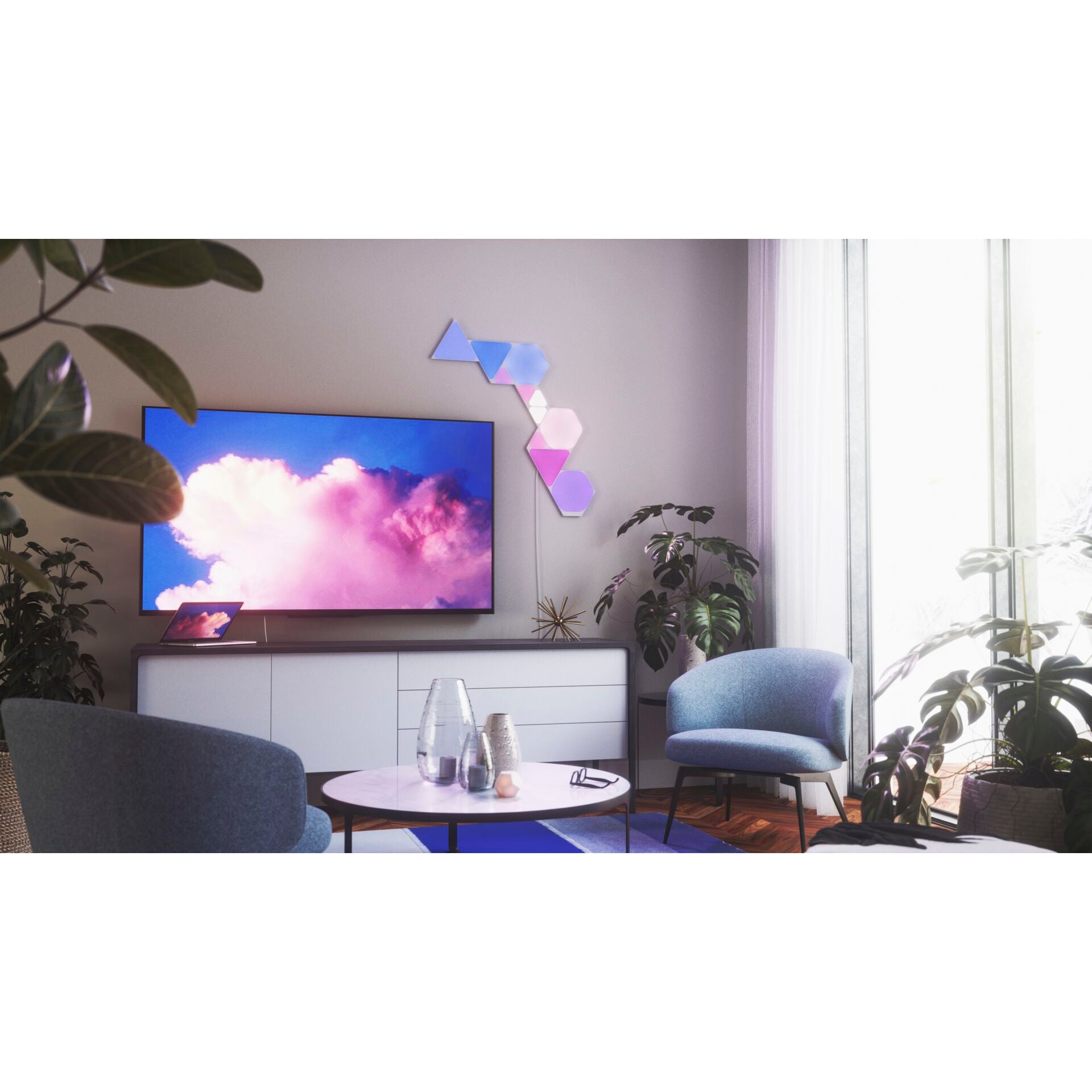 Die Nanoleaf Shapes Triangles Mini vereinen intelligente Beleuchtung mit kreativem Design und sind eine kleinere Version der Nanoleaf Shapes Triangles. Die dünnen, dreieckigen LED-Lichtpaneele lassen sich dank ihres modularen Stecksystems zu leuchtenden Kunstwerken an der Wand oder Decke gestalten. Dank der Connect+-Technologie lassen sich die verschiedenen Formen der kompletten Shapes-Reihe von Nanoleaf miteinander zu atemberaubenden Lichtmosaiken kombinieren. Durch Berührungsinteraktionen, Musik-Licht-Synchronisation in Echtzeit und die Screen-Mirror-Funktion können einzigartige Lichteffekte erzeugt und ein beeindruckendes Farbambiente geschaffen werden. Das Lichtsystem ist mit Weißlicht und einer Auswahl von über 16 Millionen Farben ausgestattet und lässt sich einfach durch Klebestreifen und ohne Bohren anbringen. Die Steuerung erfolgt per App, Steuerungsgerät, über Touch-Gesten oder Sprachassistenten wie Siri, Google oder Alexa. In der Nanoleaf-App lassen sich eigene Szenen und Wiedergabelisten kreieren. Weitere Integrationen in Smart-Home-Systeme unter anderem über HomeKit, SmartThings und IFTTT sind möglich. Auch ohne WLAN und die Nanoleaf-App lassen sich eine große Auswahl an vorprogrammierten Farbszenen über das Steuergerät auslösen.