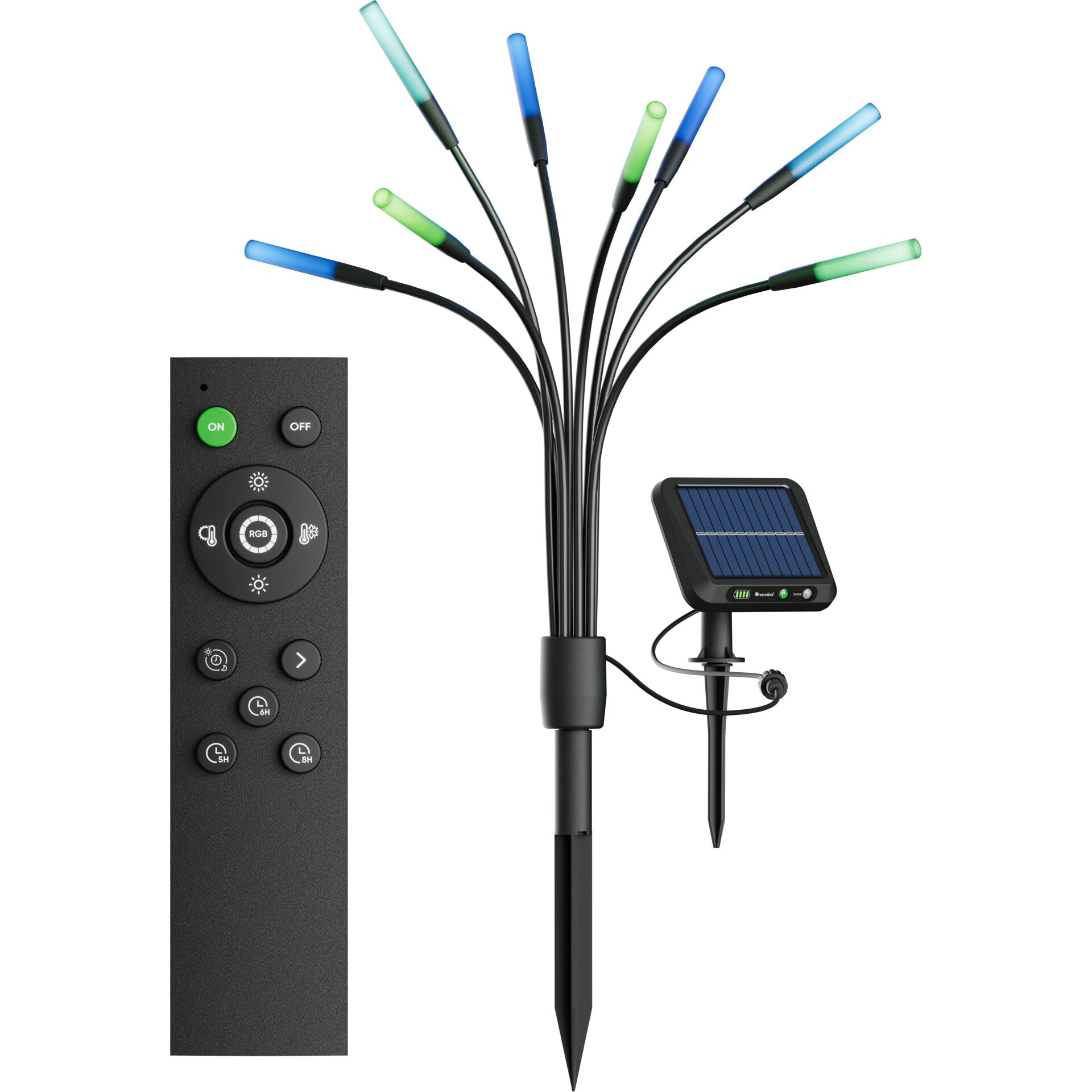 - Lieferumfang: 2x Solar LED Garden Lights (jeweils 8 LEDs), 2x langes Verbindungsstück, 2x kurzes Verbindungsstück, 2x Solarmodul, 2x Solar-Gartenleuchte Erdpflock, 2x Solarmodul Erdpflock, 1x Fernbedienung, 2x AAA-Batterien, optional Schrauben und Wandhalterungen