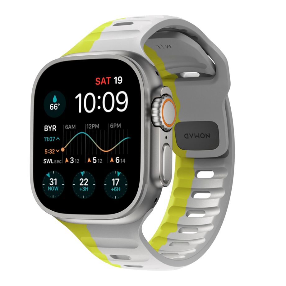 Ein Apple-Watch-Armband mit ansprechendem Erscheinungsbild, das die Aufmerksamkeit auf sich zieht: Das zweifarbige Nomad Sport Band verleiht jeder Apple Watch einen modernen und sportlichen Look und ist dabei ideal für intensive Workouts und den alltäglichen Gebrauch. Das Sportarmband hat ein leichtes und atmungsaktives Design, das aus einem weichen, flexiblen Fluorkautschuk für besonders hohen Tragekomfort besteht. Das Material gewährleistet ein ideales Gleichgewicht zwischen Komfort und Haltbarkeit und lässt sich zudem ganz einfach mit Wasser reinigen. Dank der inneren Belüftungskanäle auf der Unterseite ist das Armband atmungsaktiv.