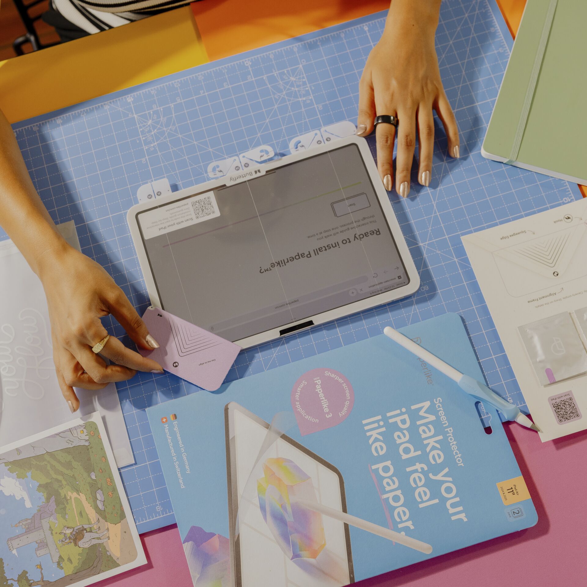 Die Paperlike 3 Displayschutzfolie bietet viel mehr als nur verbesserten Schutz vor Schmutz, Staub und Kratzern auf dem iPad-Display. Einmal mit dem Butterfly®-System nahtlos auf dem iPad angebracht, fühlt es sich an, als würde man mit dem Apple Pencil auf Papier schreiben oder zeichnen. Da die Oberfläche der Schutzfolie nicht komplett glatt ist, kann nun noch präziser mit dem Apple Pencil gearbeitet werden, denn das iPad fühlt sich unter dem Stift an, wie ein Notizbuch. Sei es zum Zeichnen oder Notizen machen, mit der Displayschutzfolie von Paperlike wird es noch einfacher, digital zu arbeiten und gleichzeitig ein normales Schreibgefühl beizubehalten. Die matte, entspiegelte Oberfläche macht es außerdem möglich, das iPad auch in der Sonne, zum Beispiel zum Streamen, optimal zu nutzen.