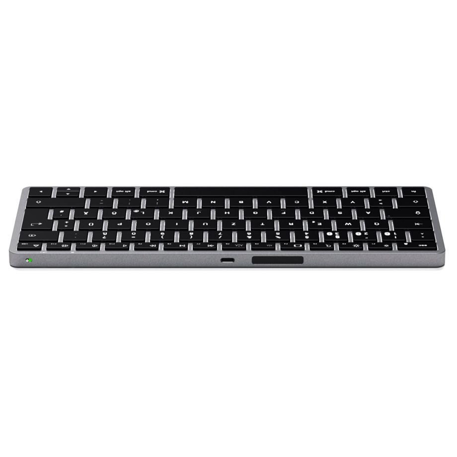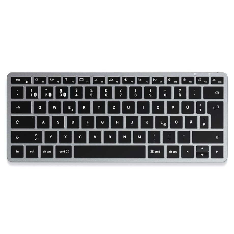 Die Satechi Slim X1 Bluetooth-Tastatur mit Hintergrundbeleuchtung wurde für Apple-Nutzer entwickelt und bietet ein vollständiges QWERTZ-Layout, Bluetooth-Verbindung zu mehreren Geräten und intuitive macOS-Funktionstasten – und das alles in einer kleinen, kompakten Größe. Die X1 Tastatur ist ideal um auch unterwegs zu arbeiten, aber auch auf dem Schreibtisch zahlt sich das kompakte Design aus. Die Hintergrundbeleuchtung kann in zehn Stufen individuell eingestellt werden. Die Beleuchtung wechselt automatisch in den Schlafmodus, wenn das Gerät 30 Minuten lang nicht benutzt wird. Außerdem kann die Tastatur mit bis zu drei Geräten via Bluetooth verbunden werden, entsprechende Bluetooth-Tasten erleichtern das Wechseln zwischen den Geräten. Geladen wird die Tastatur über den integrierten USB-C-Anschluss, ein Ladekabel ist ebenfalls im Lieferumfang enthalten. Außerdem kann die Tastatur über dieses Kabel direkt mit dem Gerät verbunden werden. Die Tastatur hat ein Deutsches Tastenlayout.