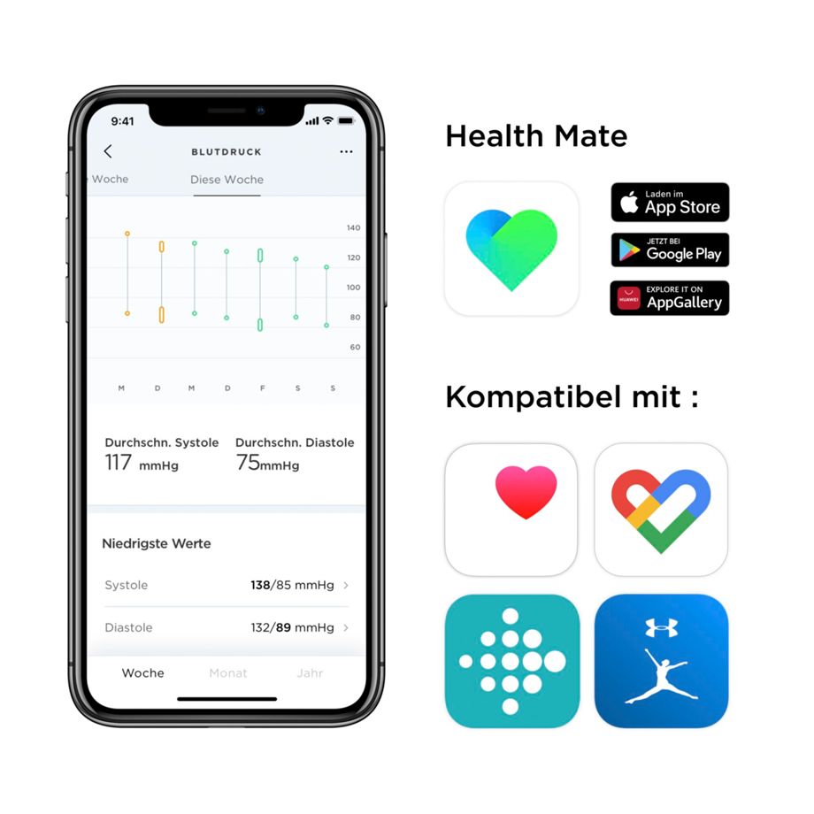 - Sofortige Ergebnisanzeige: Farbcodierte Ergebnisanzeige am Gerät & in der App auf Grundlage der empfohlenen Richtwerte der ESH (European Society of Hypertension) und AHA (American Heart Association)